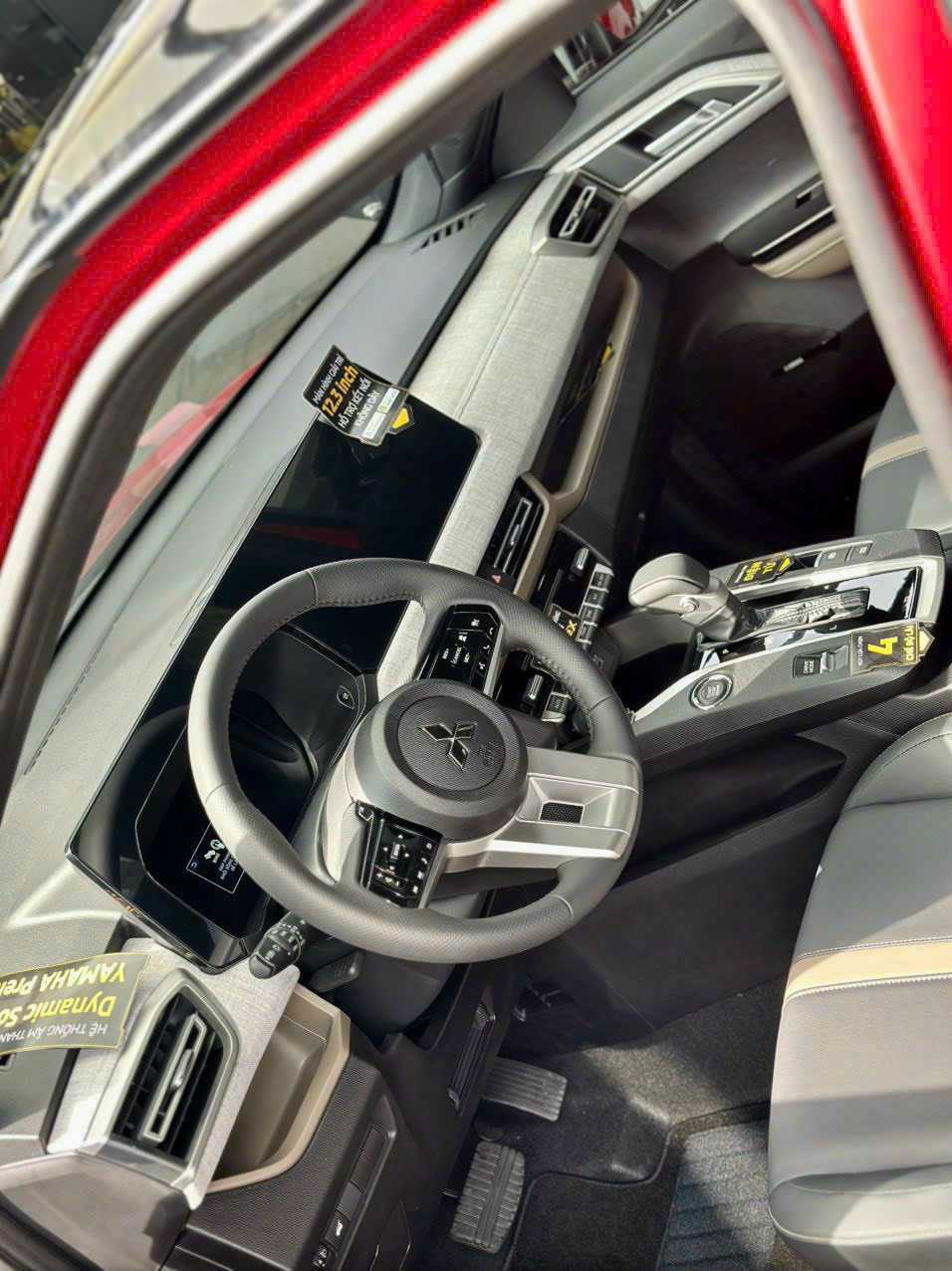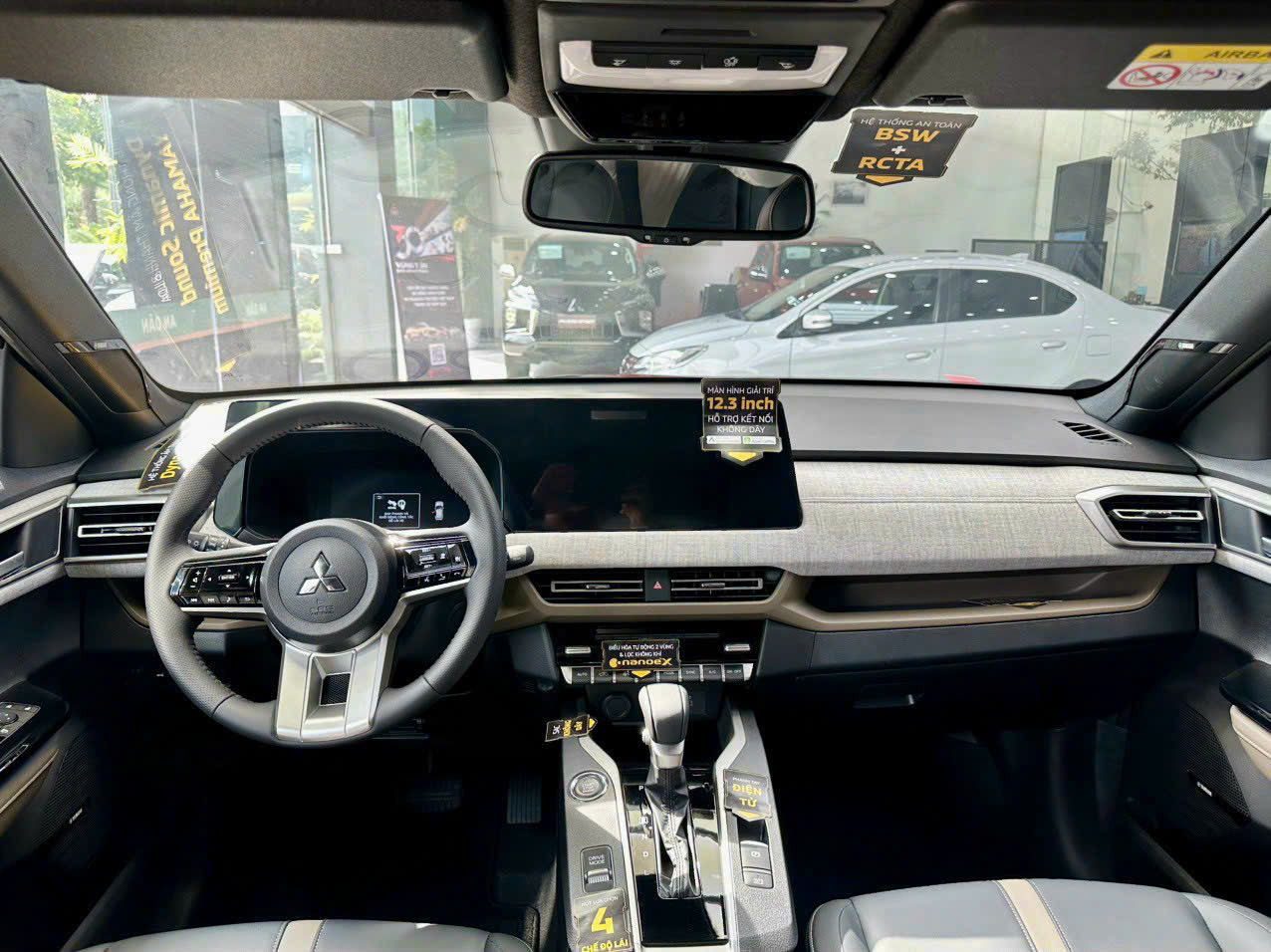 Vô lăng 3 chấu của Mitsubishi Xforce 2025 bọc da, vạt đáy D-cut. Các phím chức năng trên tay lái được bố trí độc đáo. Phía dưới là bệ cần số điện tử.