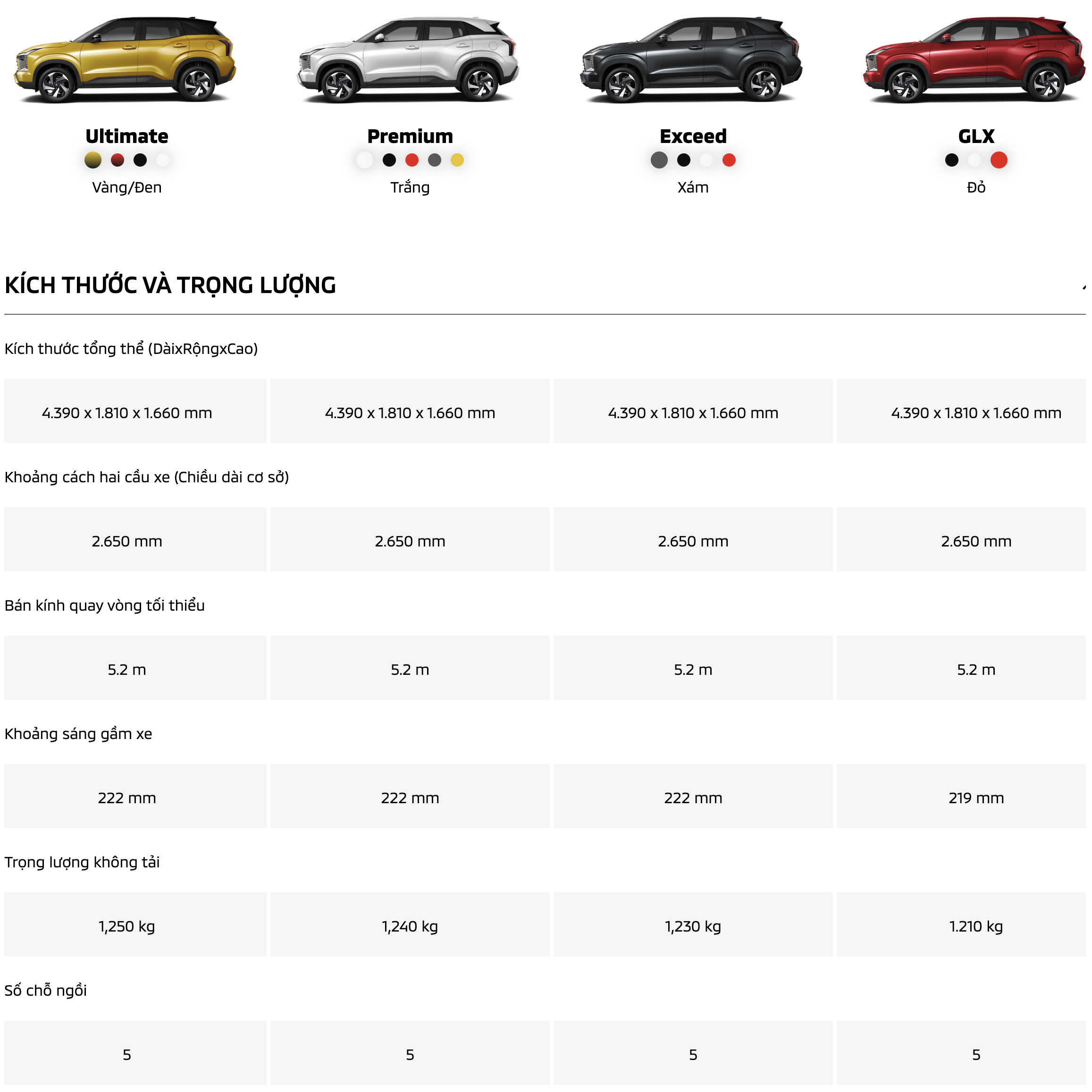 Mitsubishi Xforce 2025 có kích thước tổng thể lần lượt là 4.390 x 1.810 x 1.660 mm